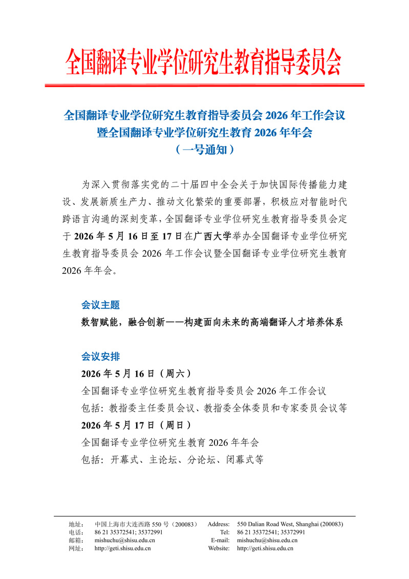 全国翻译教指委2026年工作会议暨全国翻译专业学位研究生教育2026年年会(一号通知)